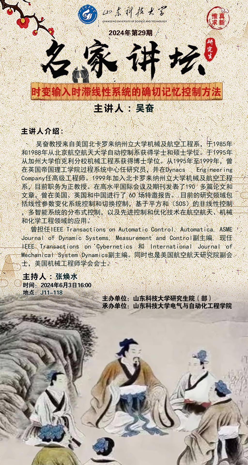 “名家讲坛”2024年第29期:时变输入时滞线性系统的确切记忆控制方法(总923期)